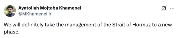 Control. Mojtaba Khamenei (if it is really him talking) said Iran would bring management of the strait into a "new stage" during those talks. He also said Iran would seek compensation for damage from the war and called the country the "definite victor."