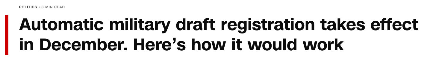Yesterday, I held off on posting about the supposed “automatic US military draft registration” kicking in this December for most men aged between 18–26.