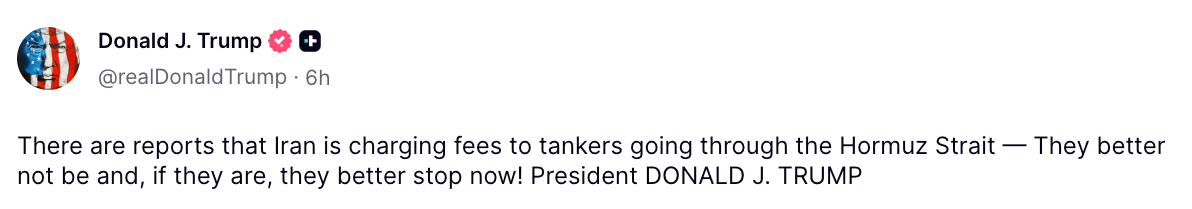 Standoff. On Thursday, President Trump demanded Iran stop charging tankers to cross the Strait of Hormuz.