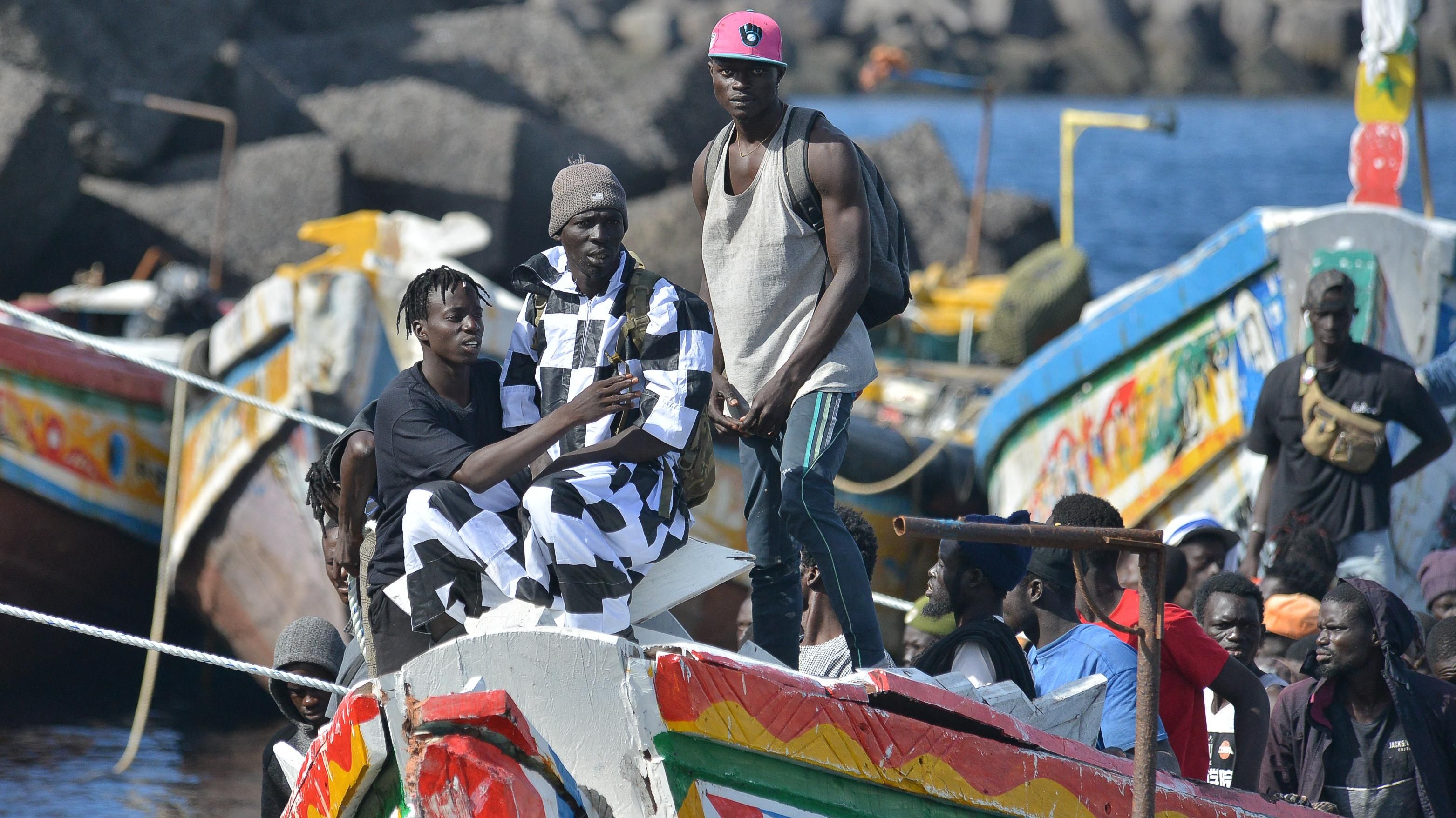 Illegal immigrants arriving by a boat at the port of La Restinga in El Hierro, Spain (2023).