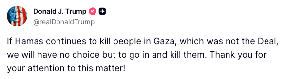 📌 Context: The ceasefire Trump brokered last week was meant to halt months of war between Israel and Hamas, but reports of Hamas reasserting control in Gaza have raised doubts about whether the truce can hold.
