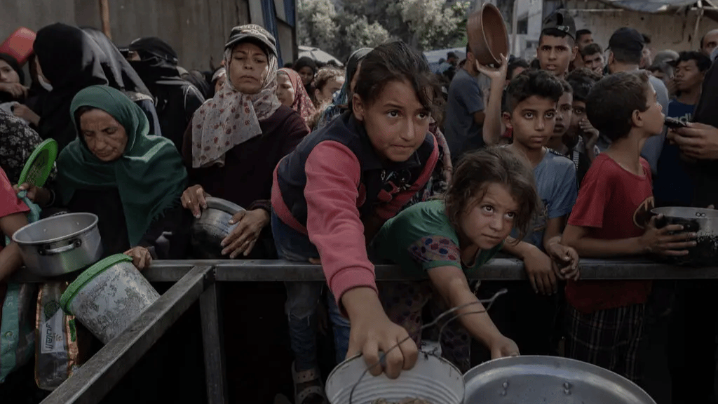 Gazans receiving food at a charity kitchen in Nuseirat in Gaza.