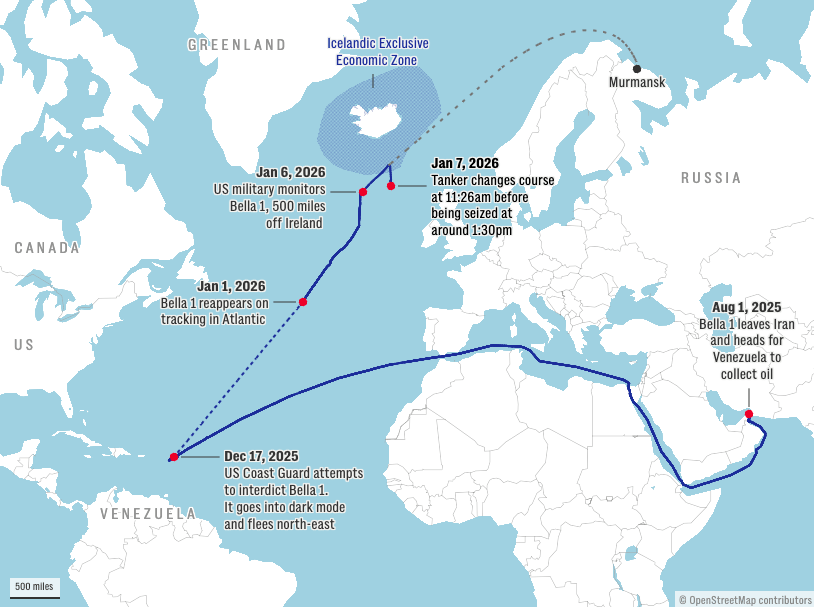 The first target was the Russian-flagged Marinera, previously known as Bella 1, tracked across the Atlantic after refusing an earlier boarding attempt near Venezuela.