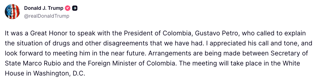 📌 Context: U.S.-Colombia ties have long revolved around security cooperation and counternarcotics policy, but Petro’s leftist government has pushed a different political line at home and abroad. This invite looks like a diplomatic reset attempt after months of insults, sanctions, and escalating talk of force.