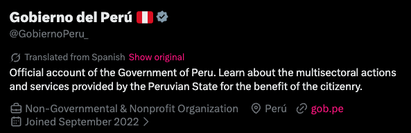 Why is the Peruvian government’s official X account tagged as an NGO?