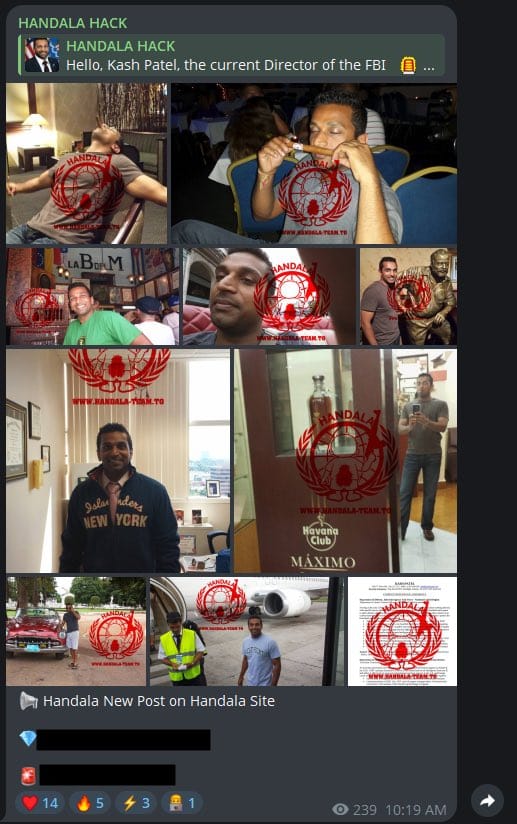 Breach. A group calling itself Handala Hack Team said it broke into FBI Director Kash Patel's personal email and posted personal photos and documents online Friday.