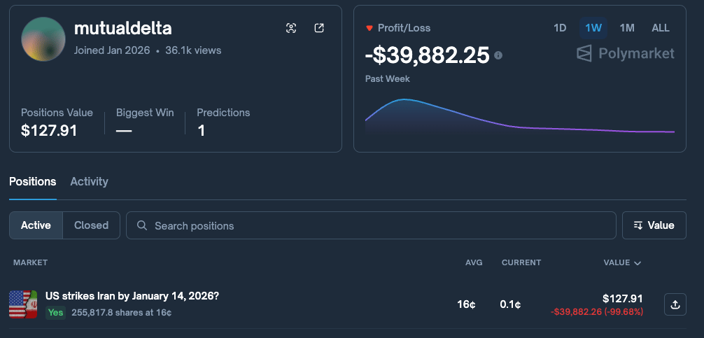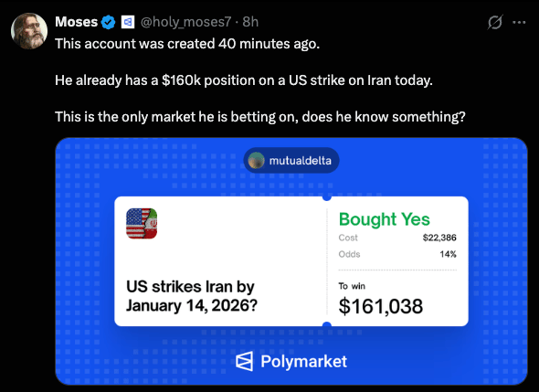 A new account was recently created to place a large bet on the U.S. striking Iran today. In hindsight, this was a poor decision (to say the least). However, some suggest it may have been a U.S. tactic to mislead adversaries monitoring Polymarket betting patterns in an effort to predict potential military actions.