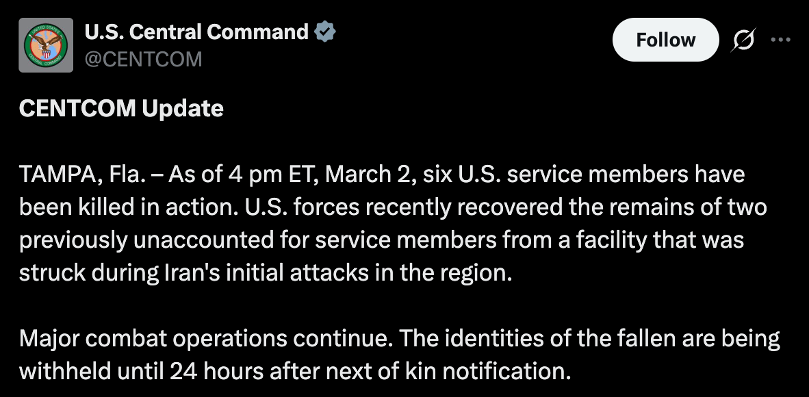 TLDR: The US military death toll in the Iran war rose to six after more losses were confirmed on Monday. Officials said two previously unaccounted service members were recovered, and another later died from wounds.