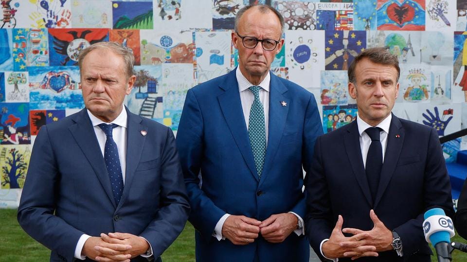Polish PM Donald Tusk (left), German Chancellor Friedrich Merz (center), and French President Emmanuel Macron (right).